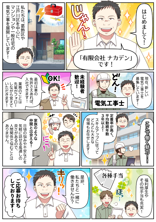 有限会社ナカデンは、東京都葛飾区を拠点にマンションの電気工事をメインに展開してきた専門業者です。設計から施工、メンテナンスや点検まで一貫対応できる強みを活かし、25年間にわたり多くのお客様から信頼をいただいています。現在、案件数が増加しており業績も安定しているため、新しいメンバーを募集します。 未経験の方でも安心してスタートできるように、資格取得支援や丁寧な教育体制を整えています。「手に職をつけたい」「電気工事でしっかり稼ぎたい」そんな想いを持った方を歓迎します!